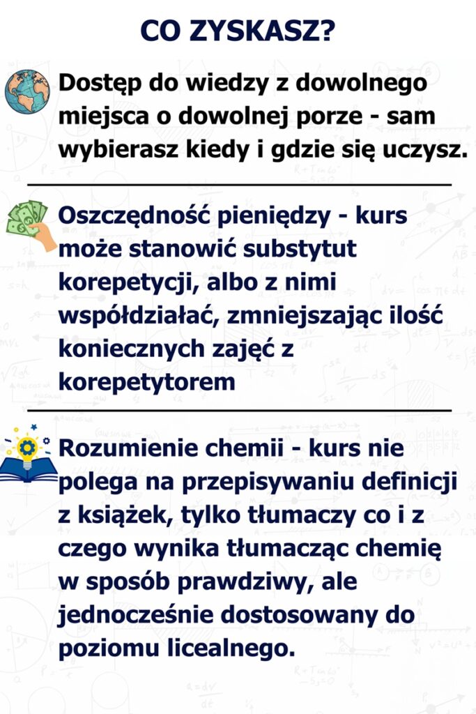 Kurs od Ach uczy chemii, pokazuje jej prawdziwą naturę kompleksowo tłumacząc zadania i materiał, a jednak stosując język i merytorykę na poziomie liceum, a nie studiów. Ten kurs pokaże Ci chemię taką jaka jest ona naprawdę.