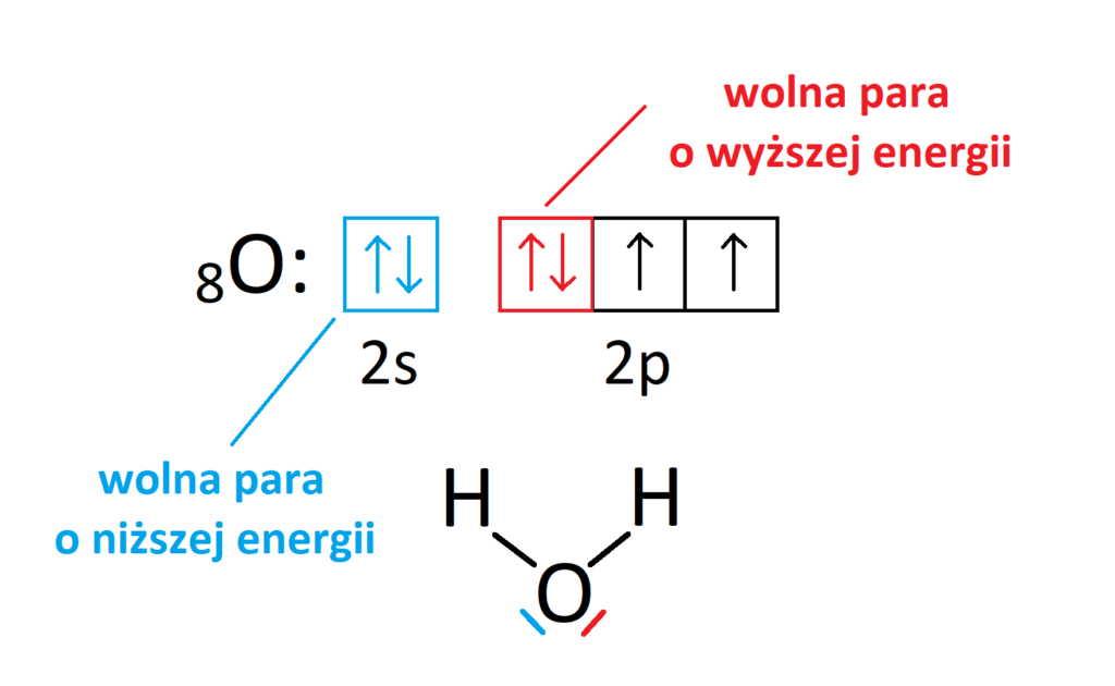 Wiemy dobrze, że energia orbitalu 2p jest wyższa niż energia orbitalu 2s. Tak więc jeżeli tlen nie uległby hybrydyzacji, to jedna wolna para miałaby energię inną od drugiej, co pokazuje poniższy szkic.