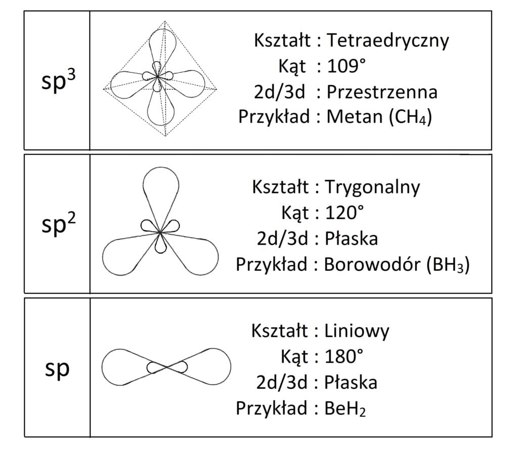 Jak dobrze wiemy, o kształcie cząsteczki decyduje atom centralny, tj. pierwiastek wokół którego rozmieszczone są inne pierwiastki budujące dany związek chemiczny. Możemy określać(przypisywać) tak naprawdę hybrydyzację każdego z pierwiastków w związku chemicznym, ale to atom centralny definiuje kształt. W licealnej chemii znamy dobrze trzy podstawowe hybrydyzacje dla których przypisujemy kształty i parametry przedstawione poniżej w tabeli: