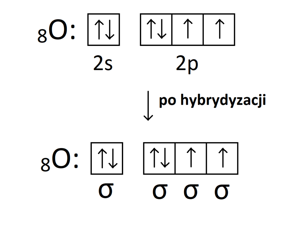 Poza tym, należy postrzegać wolne pary jako równoprawne zwykłym elektronom z wiązań kowalencyjnych. Tak więc elektrony walencyjne tlenu muszą ulec hybrydyzacji, aby wyrównać energię wszystkich elektronów, bo przecież wolne pary mogą wytwarzać wiązania koordynacyjne. W przypadku tej hybrydyzacji nie dojdzie jednak do wzbudzenia, bo elektrony nie mają „gdzie przeskoczyć”, a jedynie energia wszystkich orbitali uśredni się, co pokazuje poniższy rysunek: