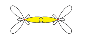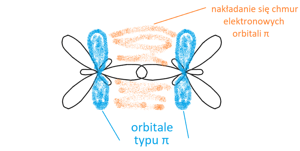 Skoro węgle wykorzystały wskazane na żółto orbitale do wytworzenia wiązania pojedynczego, to pytanie brzmi: „Gdzie może wytworzyć się wiązanie podwójne (π), skoro przestrzeń między węglami została już wykorzystana do wytworzenia wiązania σ?” Otóż wiązanie typu π wytwarza się wskutek bocznego nakładania się orbitali typu π, ponieważ nie ma fizycznie miejsca, aby orbitale mogły nakładać się czołowo. Widać to na rysunku poniżej.