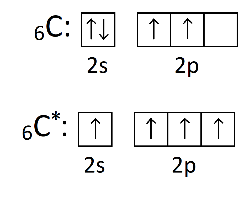 Węgiel może ulegać wskutek hybrydyzacji wzbudzeniu, co pokazuje poniższy rysunek. Wzbudzenie polega na przeskoku sparowanego elektronu na pusty orbital kolejnej podpowłoki. Stan wzbudzony oznaczamy za pomocą „*”
