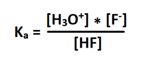 Pierwszą z nich (Ka), stosuje się do określania tego jak łatwo dana cząsteczka w reakcji z wodą prowadzi do powstania jonów H3O+. Stałą tą stosuje się w przypadku dysocjacji kwasów (bo to one przecież dostarczają jonów H3O+, bądź dla hydrolizy kationów pochodzących od słabych wodorotlenków). Dla przykładu możemy zapisać dysocjację słabego kwasu fluorowodorowego: