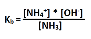 Drugą wartością jest natomiast Kb, czyli stała dysocjacji zasadowej, która określa jak łatwo dana cząsteczka w reakcji z wodą powoduje wzrost w roztworze jonów OH–. Stałą tą stosujemy w przypadku dysocjacji wodorotlenków (bo to przecież one są naturalnymi rezerwuarami jonów OH–, bądź dla hydrolizy anionów pochodzących od słabych kwasów). Ciekawym przykładem związku o charakterze zasadowym jest wodorotlenek amonu (woda amoniakalna), dla którego reakcja dysocjacji wygląda następująco: